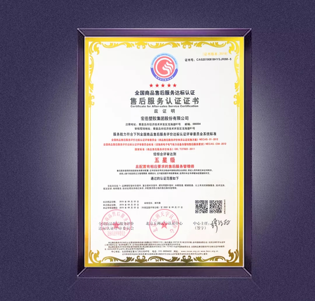 8月22日,好博体育塑胶集团股份有限公司通过全国商品售后服务达标认证,获得五星级售后服务认证证书。