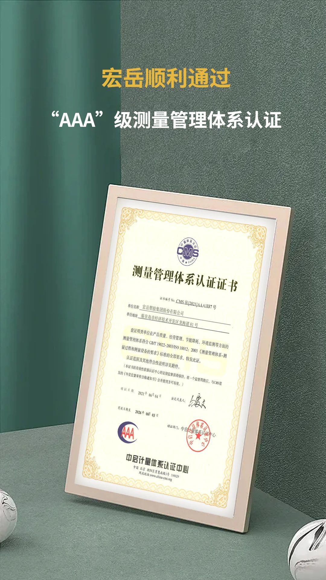 好博体育顺利通过ISO10012:2003“AAA”级测量管理体系认证,并获得证书。